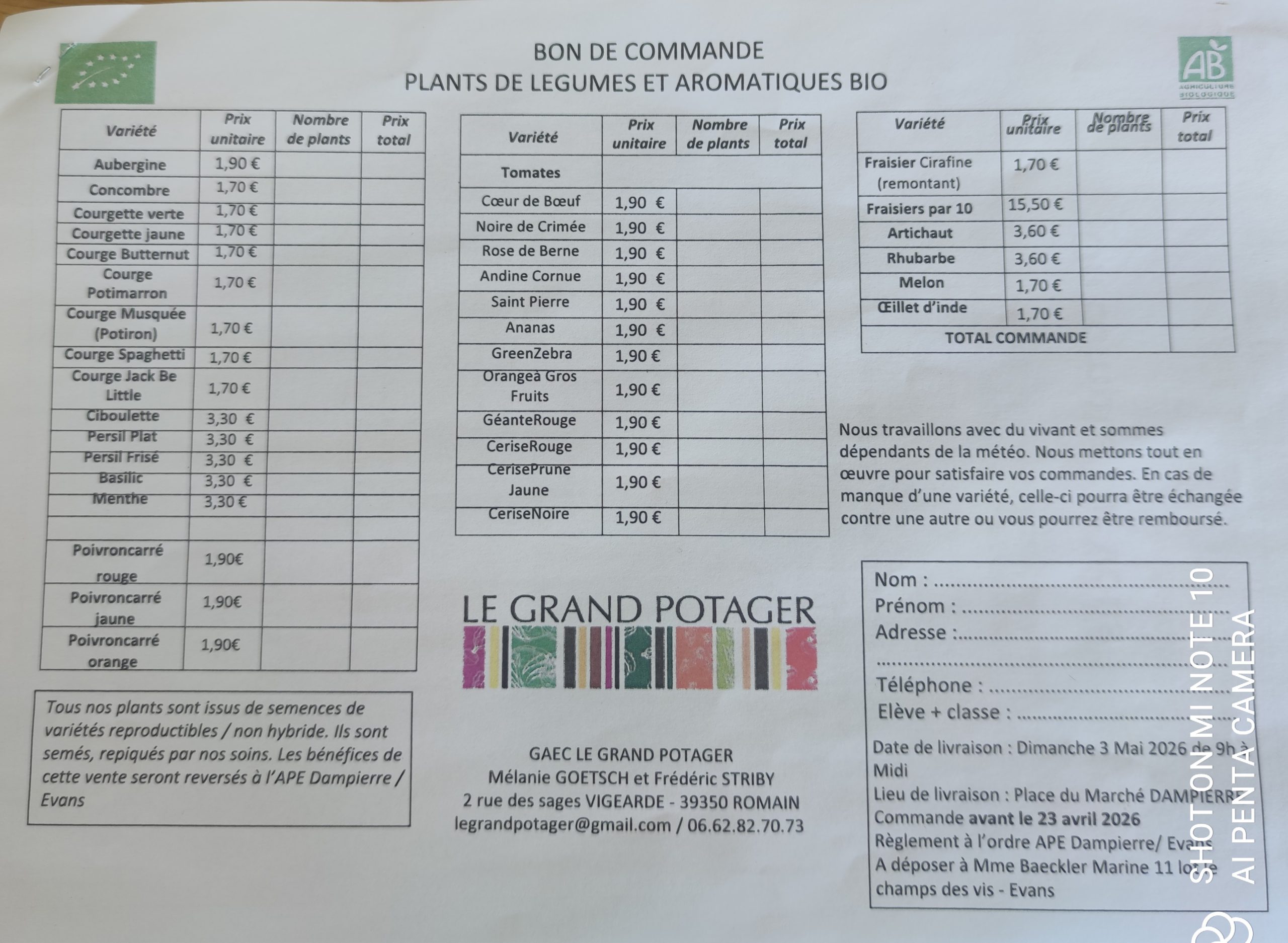 L’APE vous propose des plants de légumes et aromates. Commande avant le 23/04/2026. livraison le 03/05/2026 sur la place du marché à DAMPIERRE.